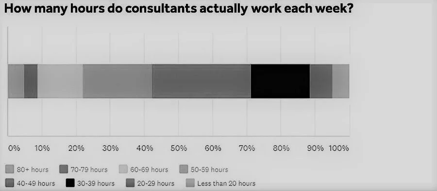 The nature of the job compels consultants to demonstrate a huge time commitment, with client project deadlines and internal work creating a formidable workload. As a result, most management consultants have to work between 50 up to 80 hours in a week to meet the demands of clients, while seven-in-ten consultants at top firms work more than their contract hours. On top of this, as it is not typical for consulting firms to pay overtime fees; on average, consultants work 9.3 hours per week more than they are paid.