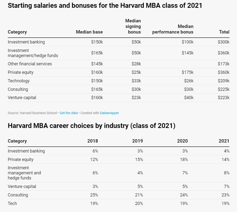 The chart below shows the going rate for the best fresh Harvard MBAs going into various jobs in financial services and elsewhere. They’re all paid well, but Harvard MBAs going into hedge funds/investment management and private equity are paid the most. – In 2021, the median MBA starting salary for both industries when signing and performance bonuses are added-in is $360k.